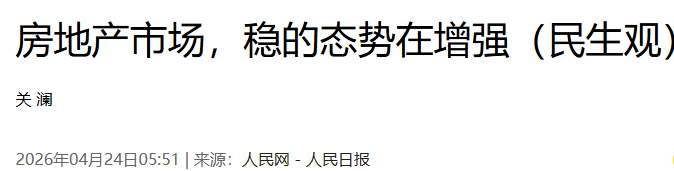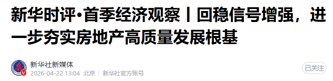仅仅两天后,4月22日,新华社发文跟进,将市场判断再往前推进一步,明确这并非简单的短期回稳,而是楼市历经深度调整后,正在积蓄筑底回暖的底层势能。文章更从经济运行和民生福祉的底层逻辑,定调房地产市场平稳发展的重要性,同时指明方向:要兼顾短期稳定市场和长期健全机制,通过精准举措推动房地产向高质量发展转型,让回暖的势头能持续、能落地。